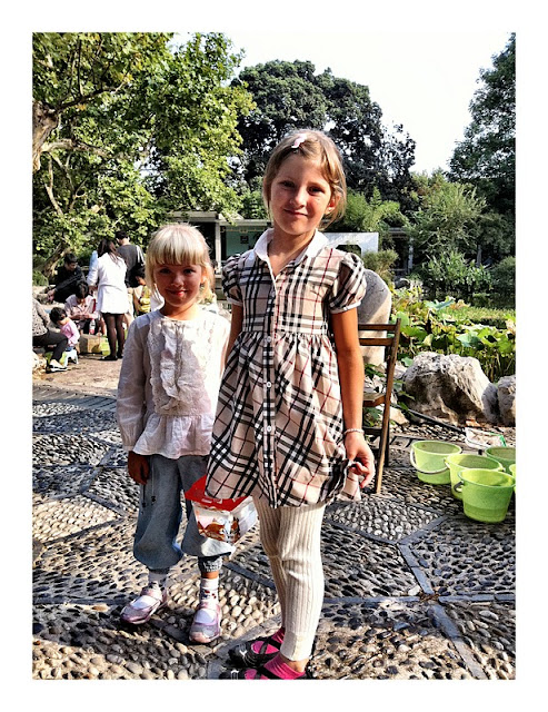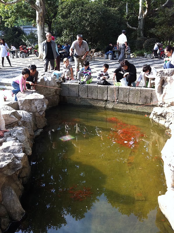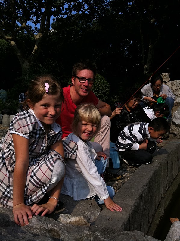 Att man kan fiska guldfiskar i Fuxing park fick vi erfara idag, då vi hamnade vid en liten damm, hyrde spön (kostade 1 RMB/ minut) och "råkade" fånga 3 guldfiskar på 7 minuter...Kinserna runtomkring verkade vara fascinerade av hur vi kunde fånga dem så snabbt. Trixet var att vi hade på ytterst lite bete (ngn deg) så att fiskarna kunde greppa kroken. Det var så kul och barnen var jätteglada att fiska, komma så nära krabbfisket som det går i Shanghai...det hela slutade med att vi köpte en liten plastlåda med lock, lite mat och plötsligt insåg vi att vi var 7 i familjen!
