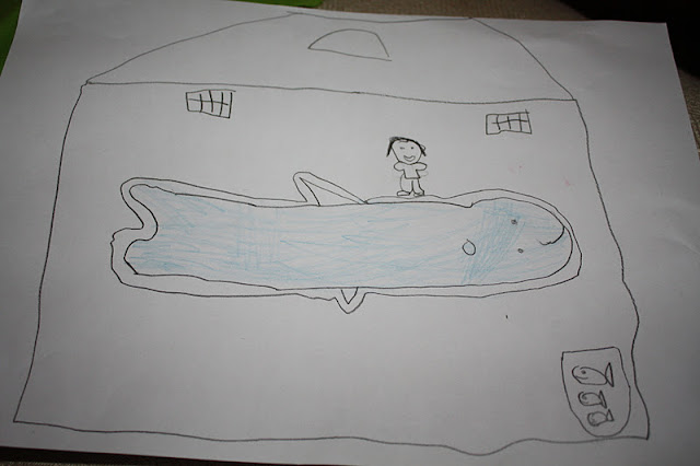 Vi såg en "delfinshow" också (jättedyr och inte värt priset...) det var dock inte delfiner utan sk beluga- valar. Nora ritade en så gullig teckning när vi kom hem på tränaren som stod uppe på belugan och åkte genom vattnet. Det var behållningen!