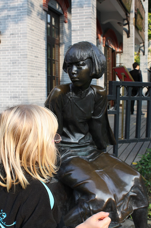 | Siri betraktar en av de många statyerna i författarkvarteren |