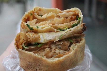 Wang Juin kommer från en provins norr om Shanghai. Hennes pappa är lantbrukare, mamma hemmafru. De bor på gården och vad jag förstått är det mkt enkla förhållanden. Hon har en bror och brorsbarn. Hon skall åka hem på det kinesiska nyåret och då lovade hon att ta kort och visa. Jag skall försöka få dem av henne och lägga ut här så ni får se. Wang Juin, som hon heter, är 28 år och nygift. Hennes man har ett relativt bra jobb, inom organiskt jordbruk. De vill ha barn nästa år säger hon. 2012 är drakens år som enligt den kinesiska kalendern är det mest lyckosamma år att födas in i.Ofta när hon kommer har hon med sig ngn kinesisk maträtt som hon köpt på gatan. Det är viktigt för henne att jag provsmakar. En del saker smakar riktigt gott medan andra bara inte går att svälja...pinsamt när man sitter där, tuggar och tuggar... :--). En maträtt som jag tycker är jättegod är de sk Jianbìng - Kinas svar på Franska crepes eller Mexikanska burritos. Supertunna stekta pannkakor fyllda med scramble eggs, sojapasta, chilisås och färska örter (ofta persilja och/eller koriander). Vår ayi lade en tunn purjulök mellan och rullade i hop och det var faktiskt gott! Den krispiga pannkakan, söta bönpastan och starka chilin i kombination är annorlunda men ljuvligt gott!!