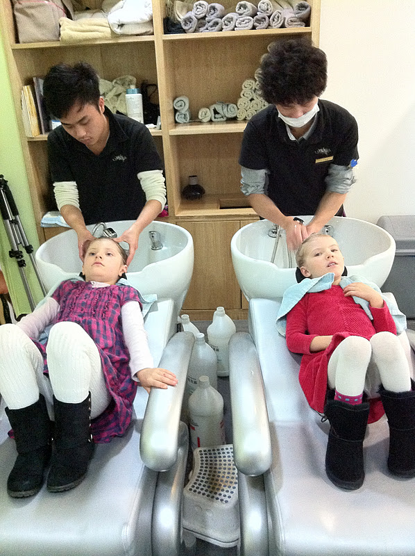 Tjejerna ville tvätta håret och de njöt för fullt och var så söta när de låg där i fåtöljerna. Siri undrade varför hennes frisör hade munkavel... :-)