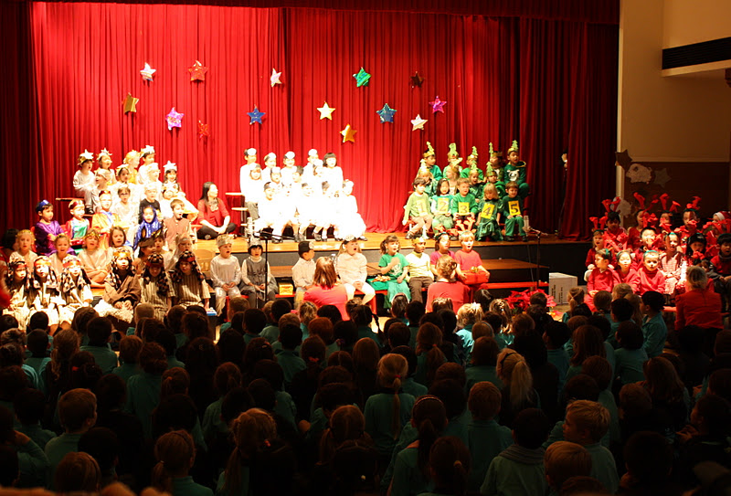 I går var det julshow på skolan. Imponerande hur personalen lyckats lära barnen hela den fina repertoaren och dessutom att alla barn stod på sina platser och gjorde det de skulle....Varje klass var utklädda. En representerade snön, en änglar, en jesus och Maria och beduinerna, en granar och en tomten. Varje klass hade sin sång och de var verkligen duktiga och SÅ söta. Inte ett öga var torrt...
