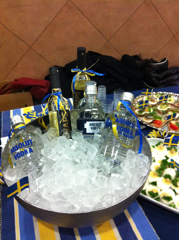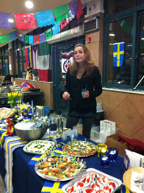 God kväll, eller god natt för det är snart mitt i natten här nu. Jag är nyss hemkommen från BISS (brittiska skolan) där det varit en välgörenhetskväll. Där kunde varje land representera sig genom att bjuda på traditionella maträtter/plockmat. Det var föräldrar från 14 länder på plats och fantastiskt god mat! På det skandinaviska bordet fanns tunnbrödrullar, köttbullar, smörrebröd, snittar, mandeltårta, chokladbollar mm. Det fanns också en stor skål med svenska drycker...Bordet var uppskattat och det tog inte många minuter innan det var soprent!