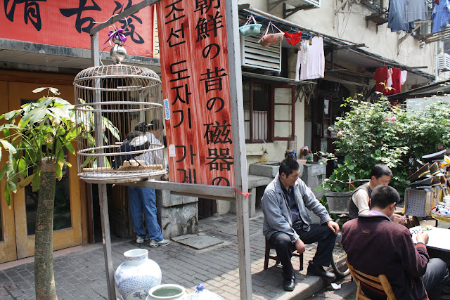 Antique market på Dong Tai Lu kommer att rivas. Inte bara marknaden utan hela området med bostäder för Shanghaibor. Extra sorgligt när man promenerar omkring och ser vardagslivet där ute på gatorna och i de små gränderna. Idag vandrade vi omkring tidigt, innan det hunnit komma så många turister. Den lilla familjen med sin bebis, gåstolen på gatan och mormor/farmor som hackar grönsaker på en träpall. Eller de fyra männen som spelar kort och röker på den stackars skatan i buren bredvid. Handlarna som precis öppnat sina butiker småpratar med varandra och förbipasserande. Försöker ivigt locka in oss till att bli deras första kunder för dagen.