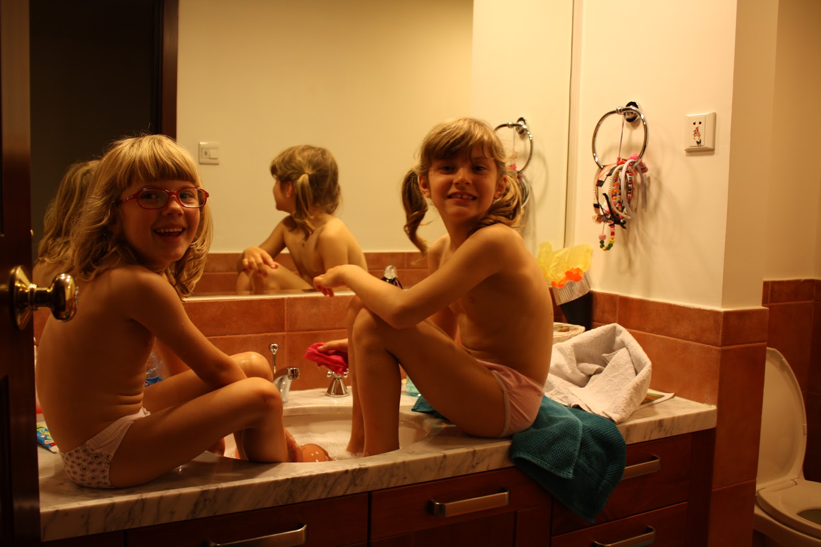 Jag är ensam med tjejerna i två dagar nu. Rikard är i Chen...någonting. Ligger i närheten av Hongkong. Han är där med en kollega för att besöka en fabrik. Ikväll blev det fotbad för tjejerna innan läggdax. De älskar att bada fötterna - kanske något de ärvt av sin far :)