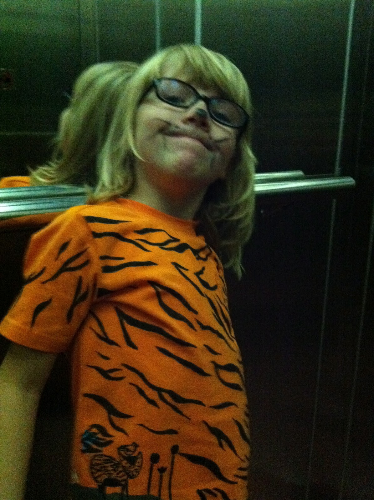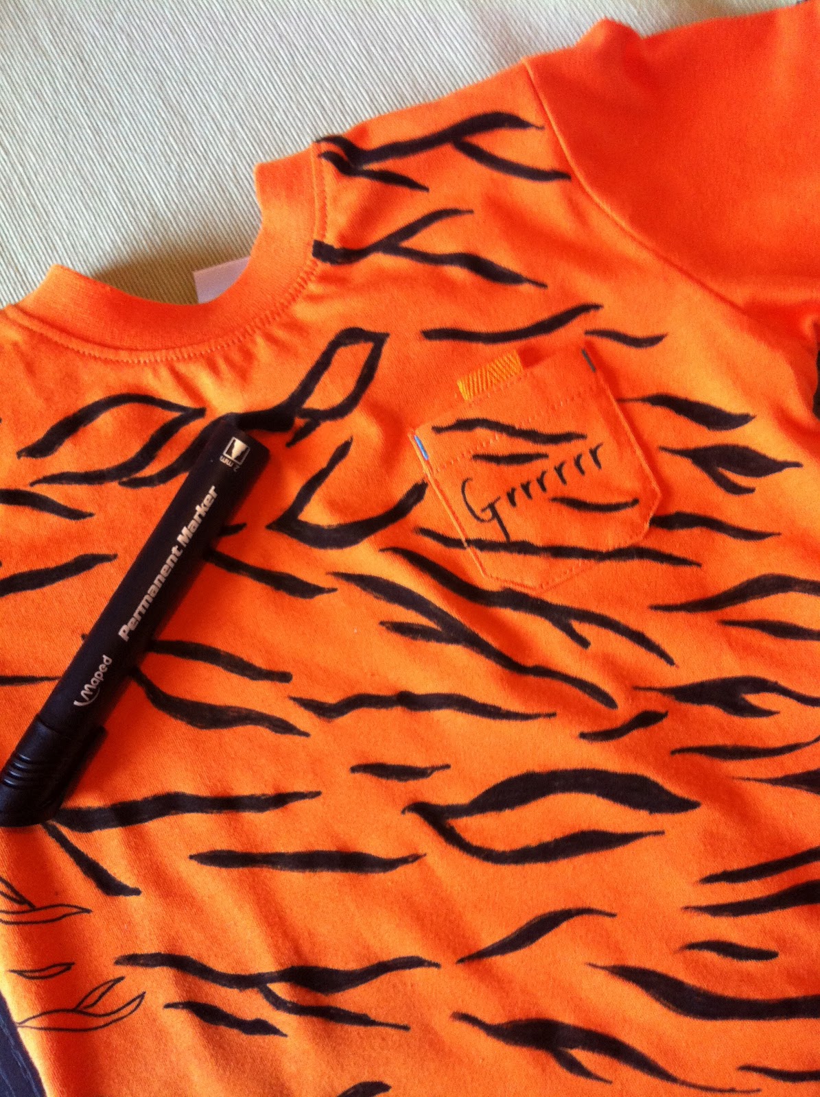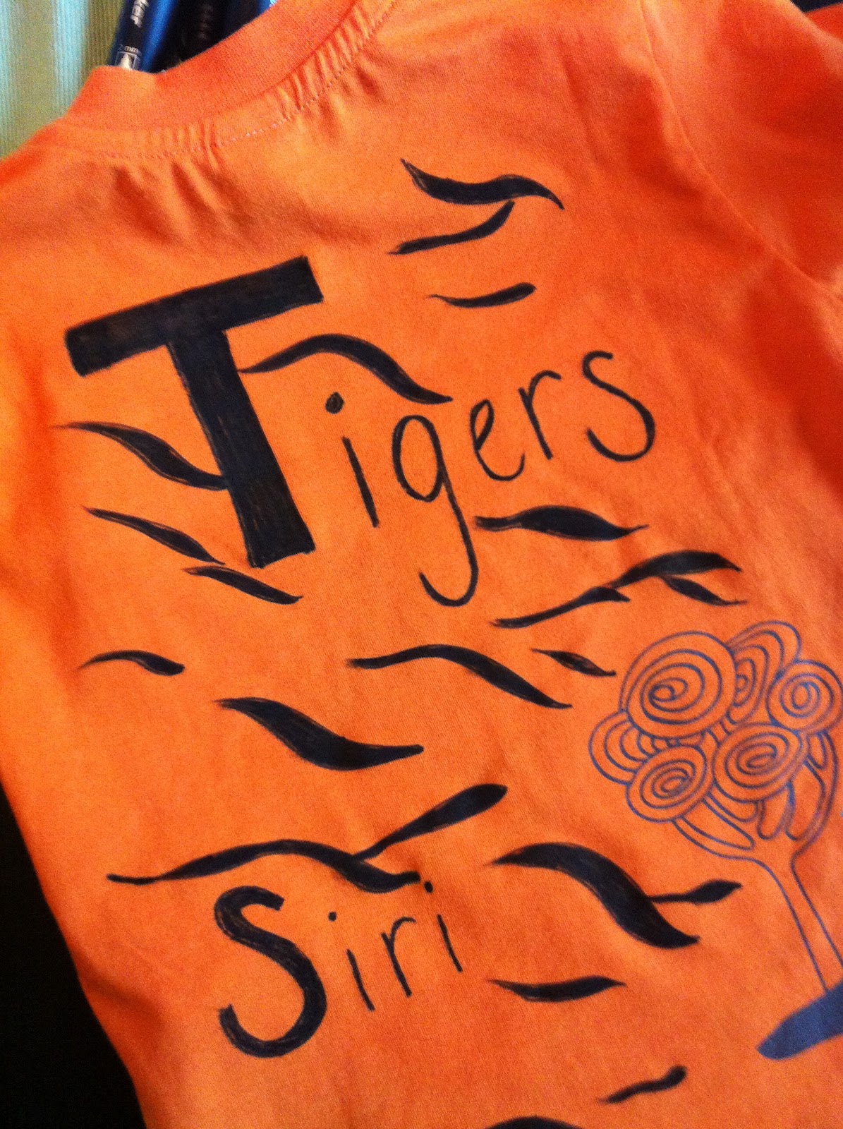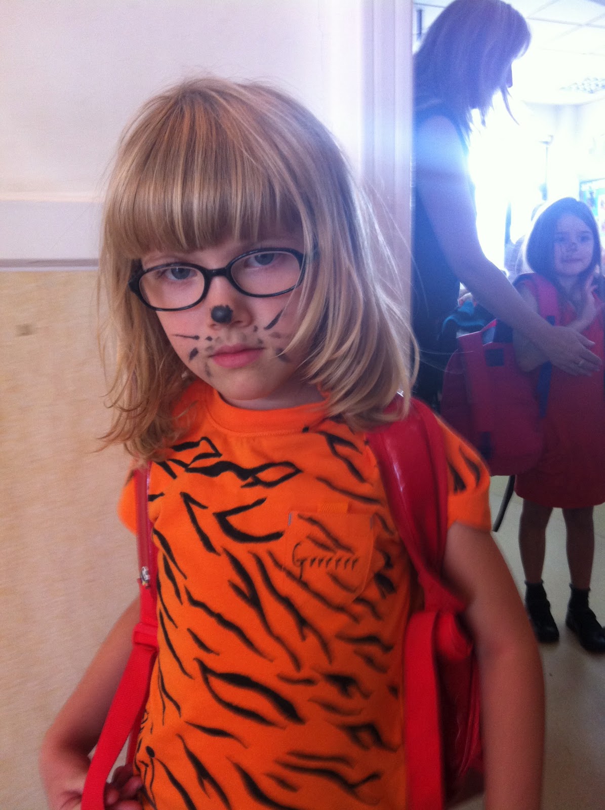 Idag hade Siri fotografering för skolans årsbok! De skulle vara tigrar - hon går ju i "tigers". Jag var runt på flera ställen i går och letade utstyrsel men hittade inget så jag köpte en orange t-shirt som jag amatörmässigt designade själv med tigermönster. Det var faktiskt kul och Siri blev jättesöt i tröjan och sminkningen som de gjorde på skolan! Lite arg och trött var hon när jag hämtade henne (som en riktig tiger :) men det gick över efter lite lek!